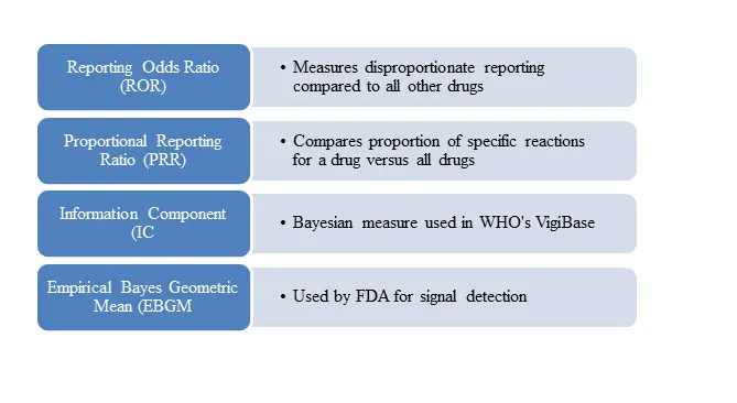 These statistical methods efficiently screen large datasets to identify potential signals for expert clinical review.